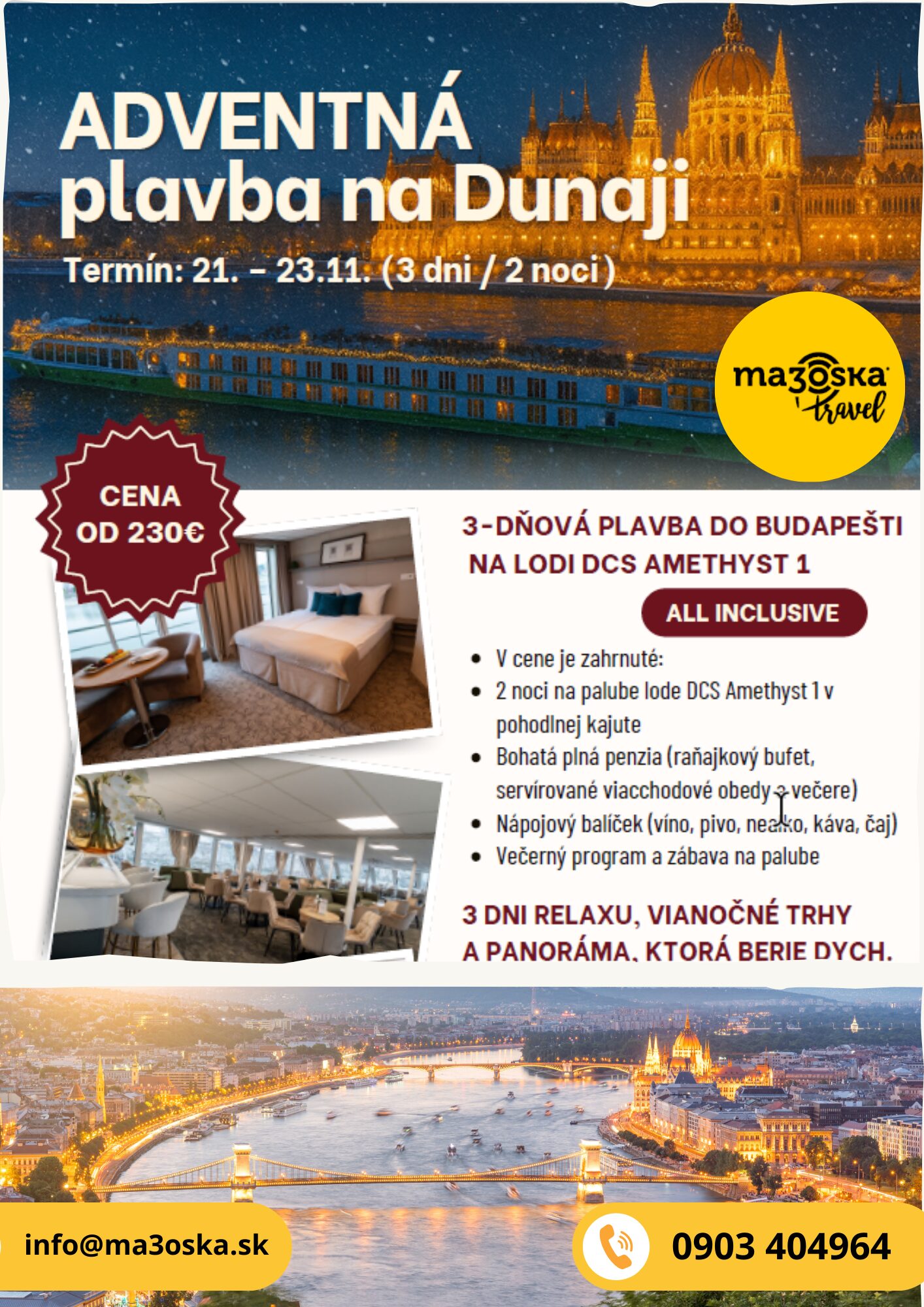 Predvianočný čas má svoje jedinečné čaro – rozsvietené mestá, vôňu vareného vína, škorice a pečených gaštanov. Spojte túto atmosféru s nezabudnuteľným zážitkom – plavbou po Dunaji na luxusnej riečnej lodi DCS AMETHYST 1. Z Bratislavy sa vydáme smerom do Budapešti, kde na vás čakajú jedny z najkrajších adventných trhov v Európe.